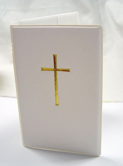 Plastik-Einsteckhülle, wattiert, Farbe: weiß, Mit Prägung: Gold-Kreuz, Material: Kunststoff, passend für das Neue Gotteslob, Maße: 18 x 12 x 4 cm.