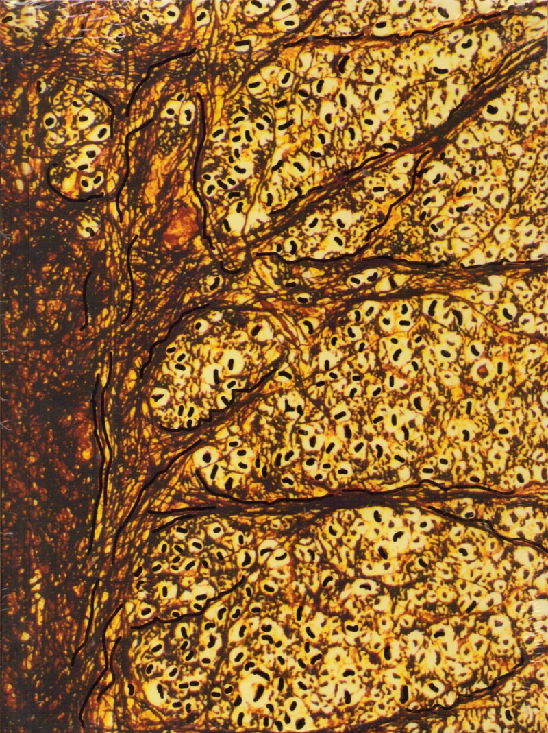 Histologisches Präparat der weißen Substanz (Substantia alba) des Rückenmarks. In der Substantia alba verlaufen die Nervenbahnen für die motorische Steuerung vom Gehirn in die Peripherie und die Nervenbahnen für die Weiterleitung der sensiblen Wahrnehmungvon der Peripherie zum Gehirn. Blanko-Notizbuch mit Lesebändchen.