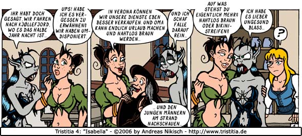 Um etwas Geld mit ihren Waren und Dienstleistungen zu verdienen begeben sich die Hexen und Tristitia wieder auf große Fahrt. Als sie bei der Hexe Pallas, einer Freundin von Lexi, einkehren treffen sie auf Antonio.